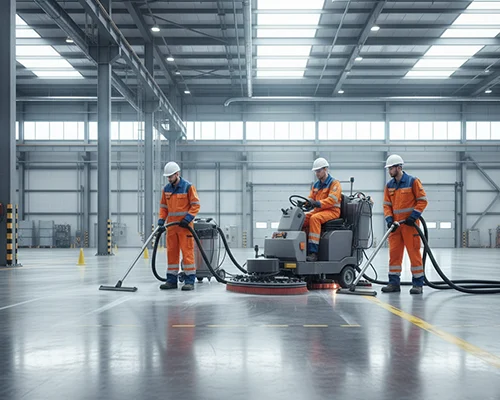 Heavy-duty industrial cleaning solutions for warehouses, factories, and manufacturing facilities with specialized equipment and safety-first approach.